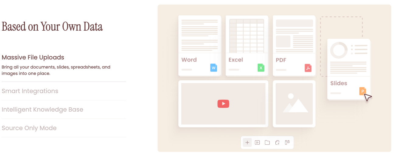 Like NotebookLM, it doesn’t start with a chat box. Users upload files and information sources first. AI processing comes later.