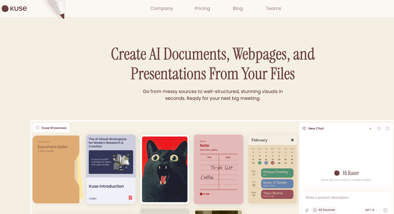 Instead of asking users what they want to generate, Kuse asks them to upload what they already have: documents, PDFs, research notes, internal files, messy information of all kinds. Only then does AI step in.
