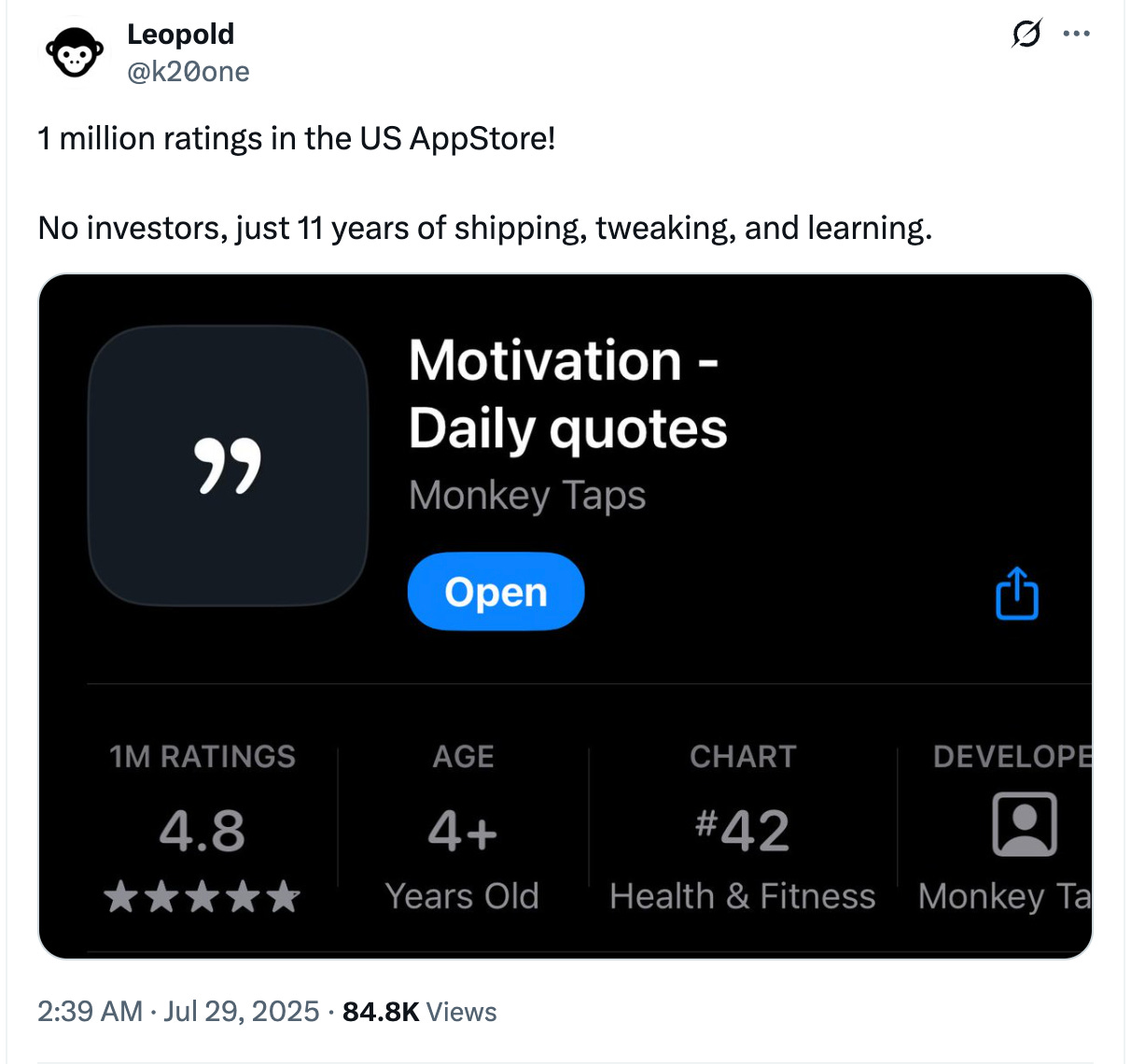 Today, a post on X from Leopold with just 800+ followers attracts me. He mentioned that the app Motivation had surpassed 1 million ratings on the US App Store — No investors, just 11 years of shipping, tweaking, and learning.