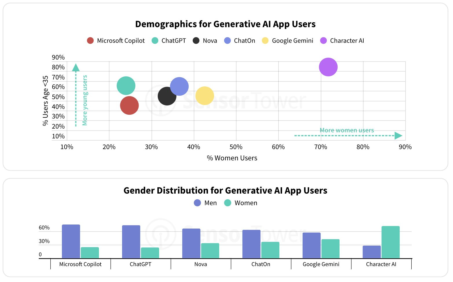 Research shows that C.AI’s user engagement ranks among the highest in the AI space. Over 70% of users are women, and nearly 90% are under 35—completely different from productivity-focused AI products.