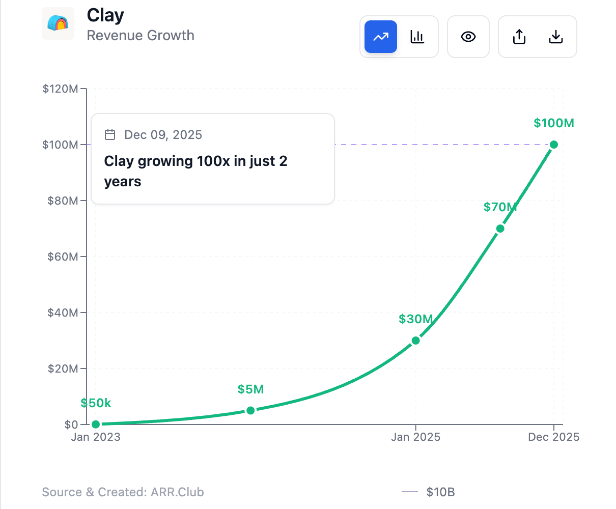From there, Clay didn’t just scale; it created an entirely new AI-native function: GTM Engineering. Their valuation quickly climbed to $3.1B. And today, Clay announced that its ARR has surpassed $100M, growing 100x in just two years.