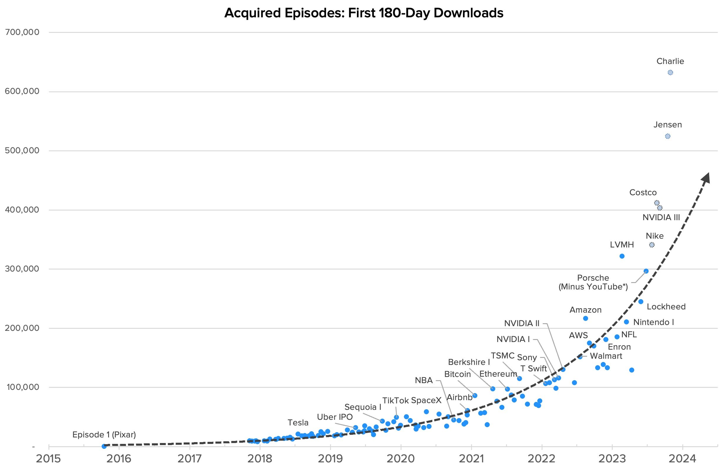 According to Acquired, the show has over 450,000 active listeners every month. Additionally, each podcast episode has been downloaded by over 350,000 unique listeners within the first six months, and this number is increasing by more than 100% every year.