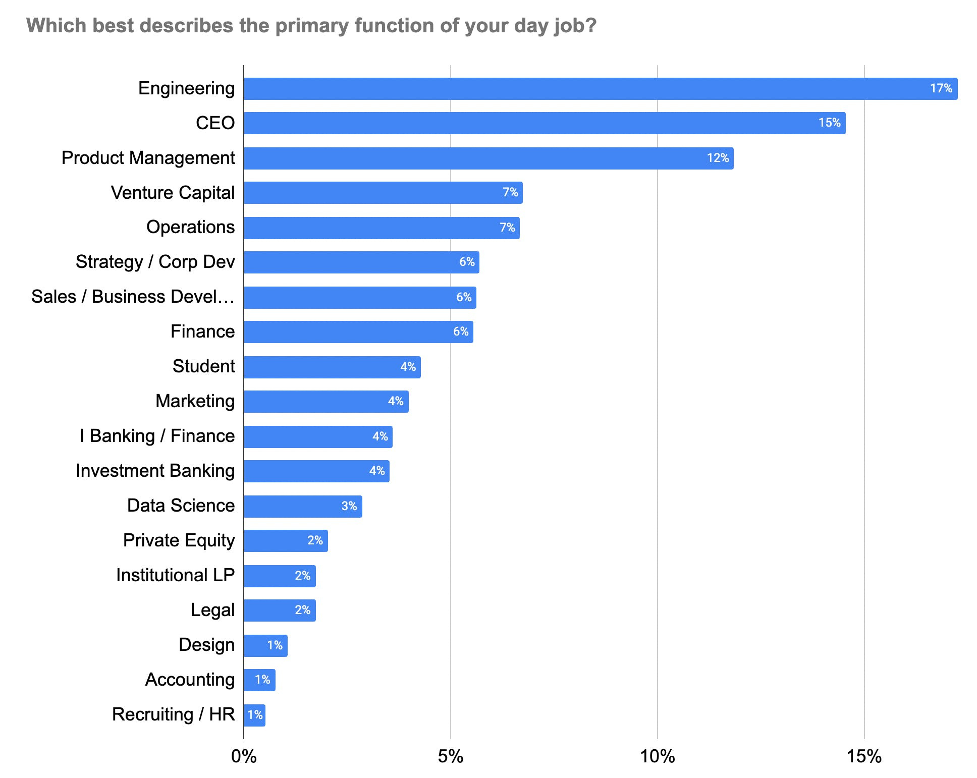 Capital ecosystem: More than 30% work in venture capital, limited partner (LP), or other investment, finance, or corporate development roles.