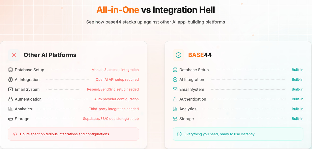 Unlike other products like Bolt or Lovable, Base44 is even simpler. It integrates the entire tech stack (see image below), allowing users to build and deploy everything through conversation alone, with no need for manual configuration. That includes database setup, OpenAI API integration, email, auth, analytics, etc.