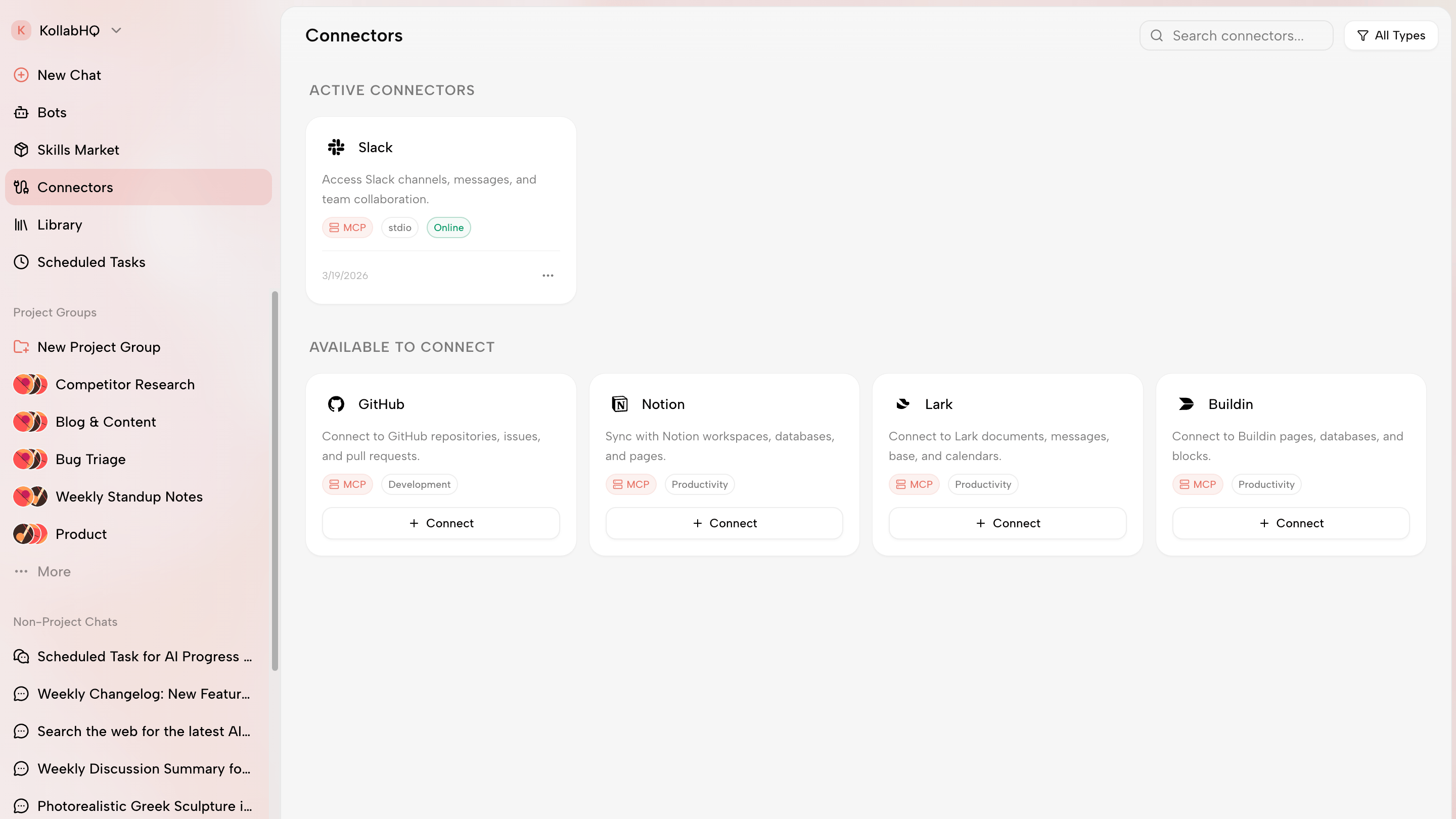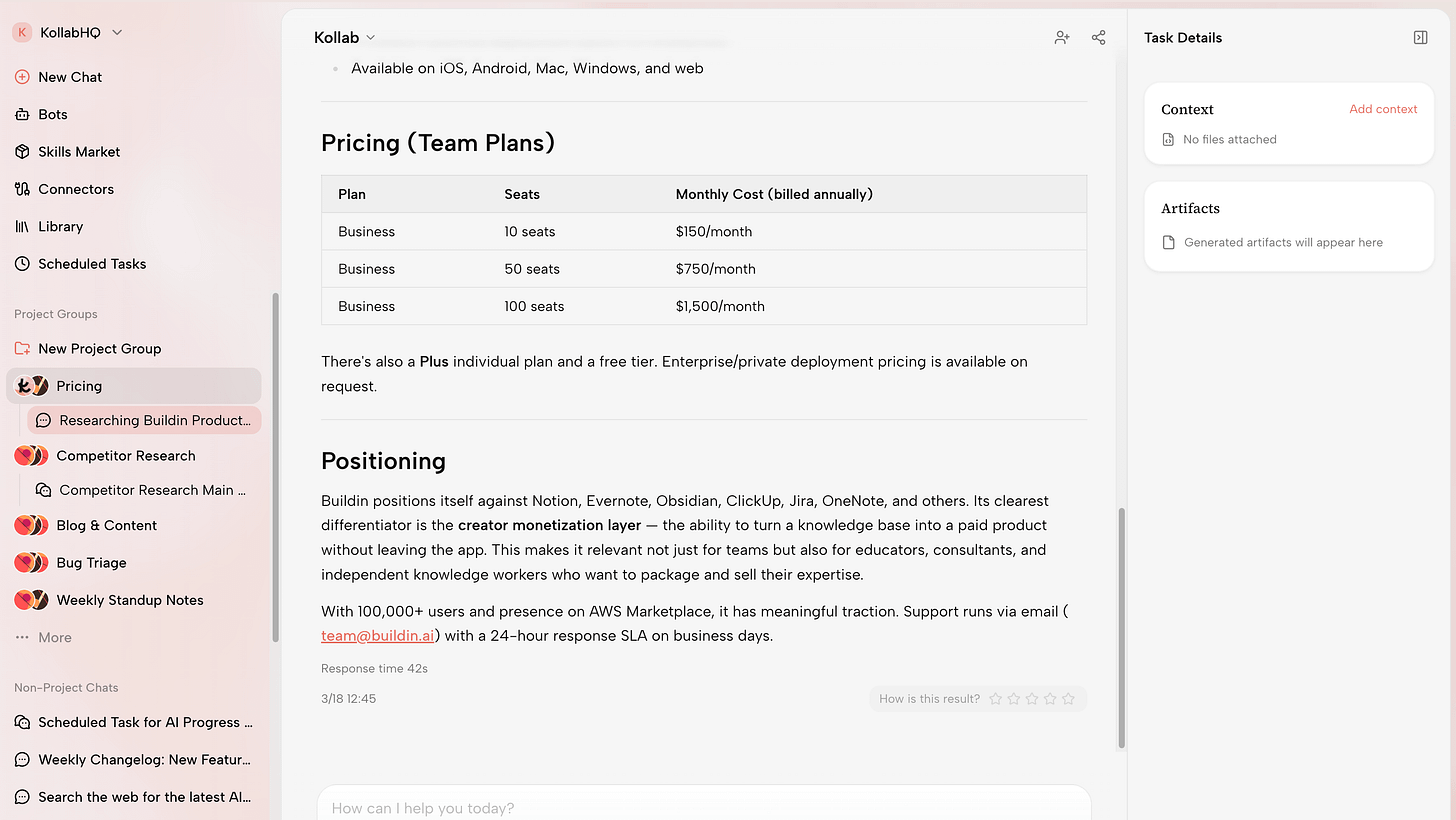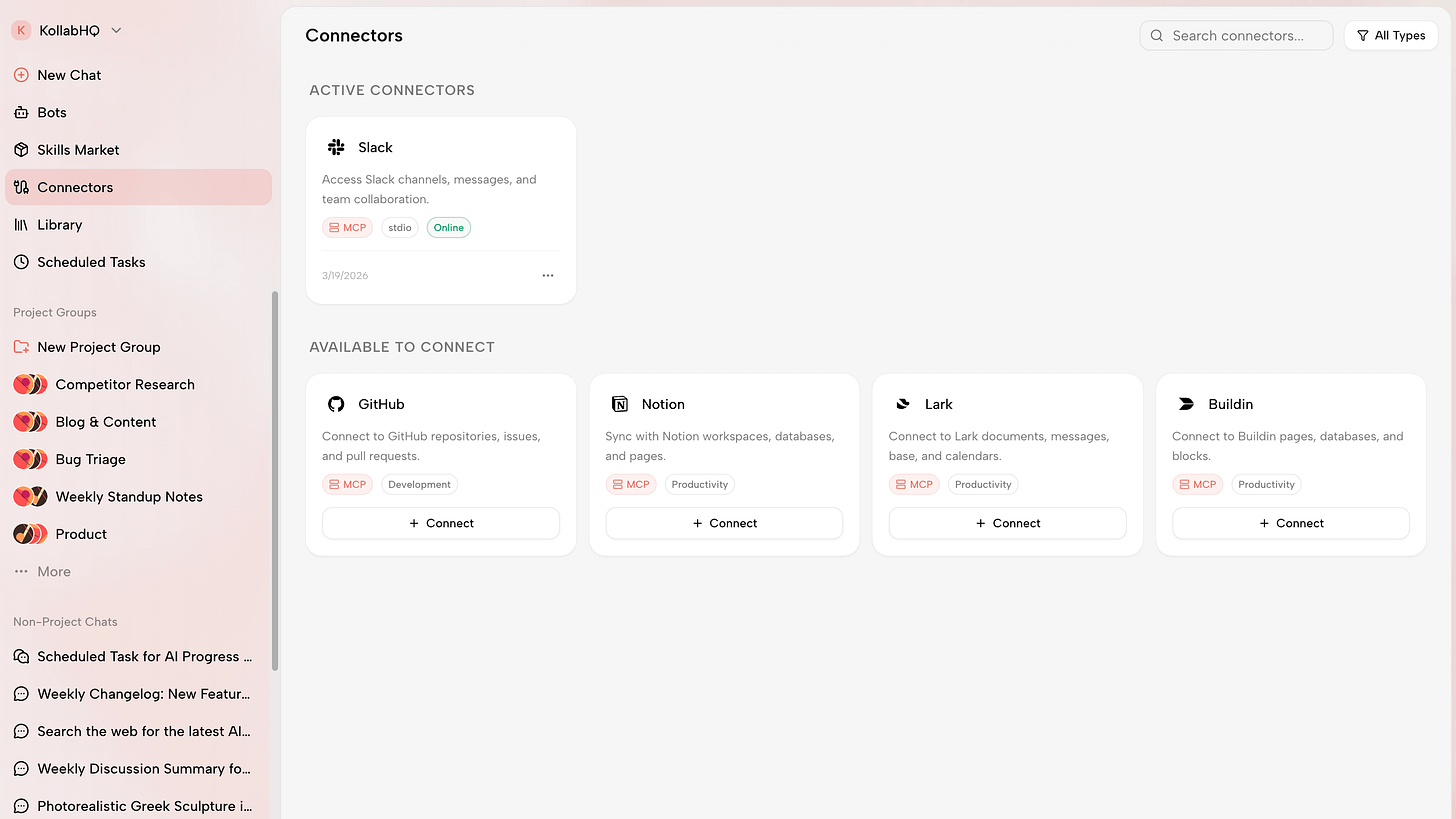The logic is pragmatic: no team is going to migrate away from tools like Slack, Notion, or GitHub just because of a new AI product. So instead of replacing them, Kollab integrates with them.