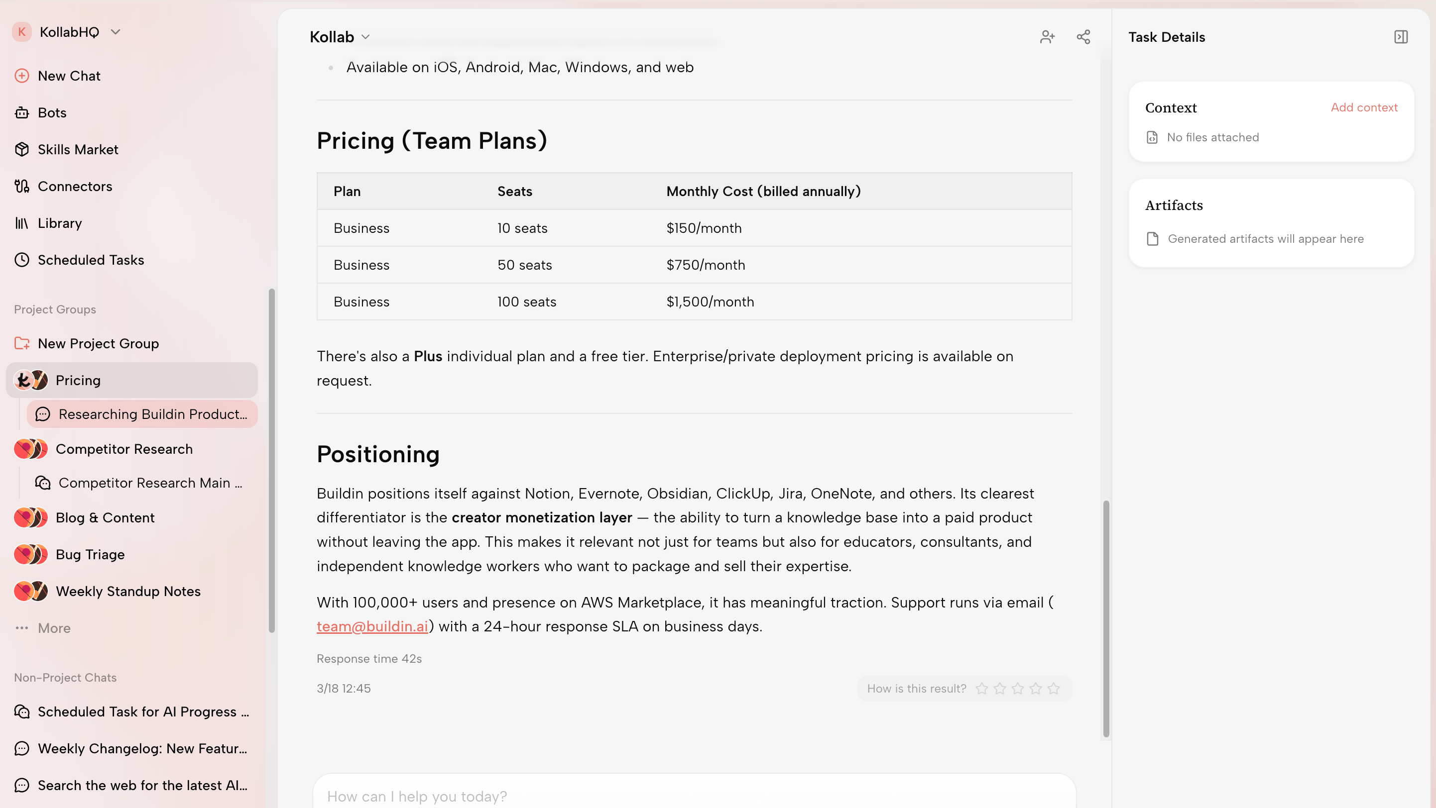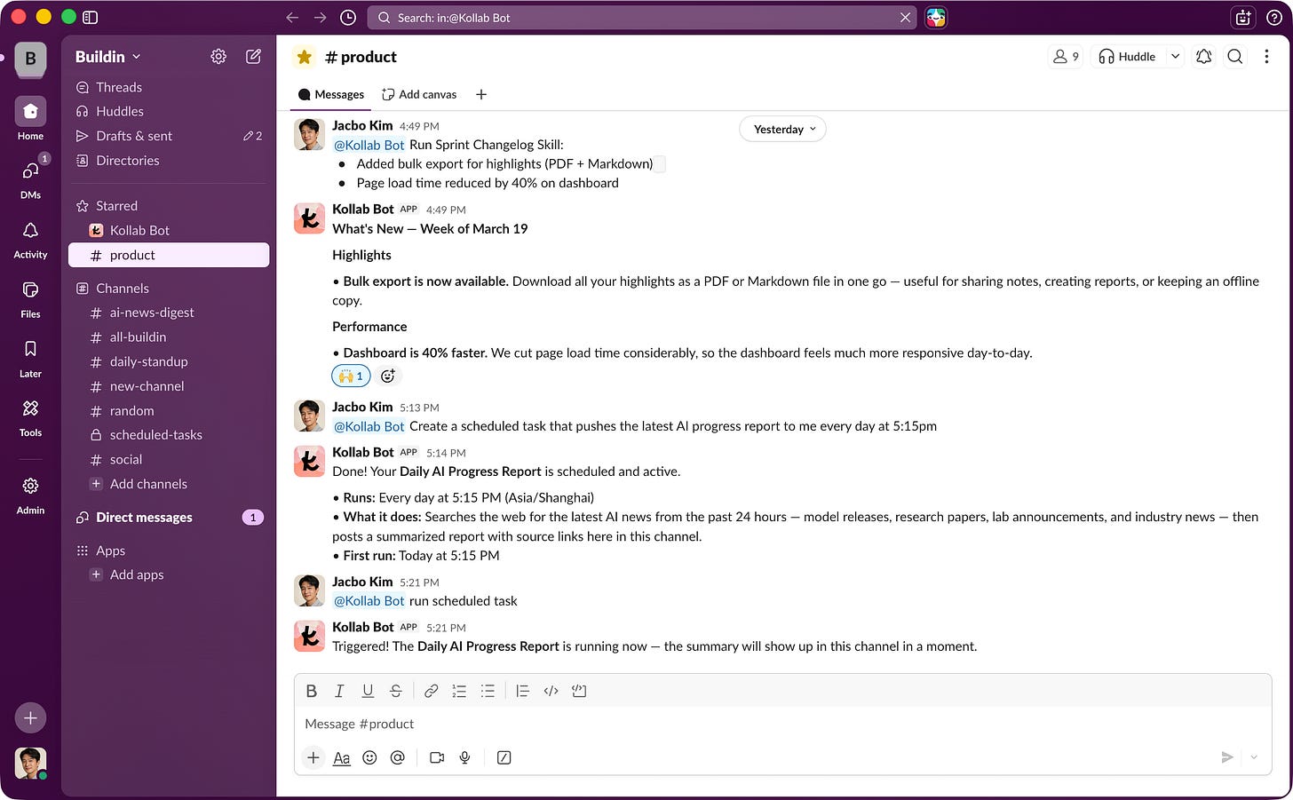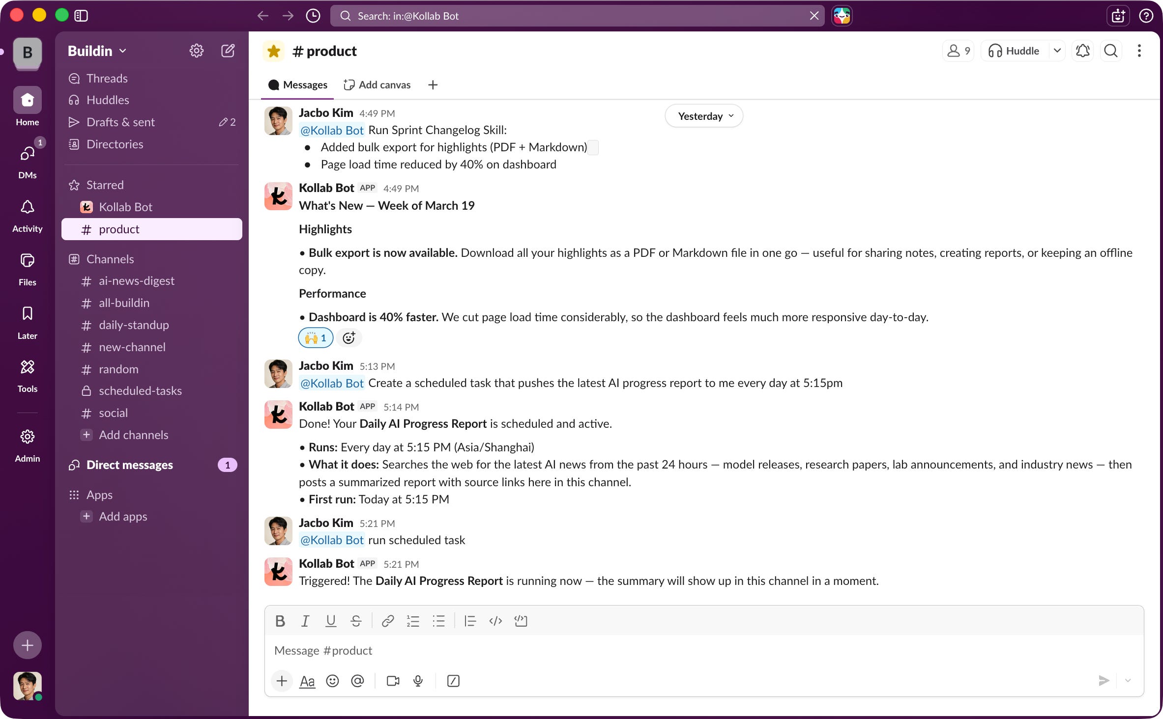 The logic is pragmatic: no team is going to migrate away from tools like Slack, Notion, or GitHub just because of a new AI product. So instead of replacing them, Kollab integrates with them.