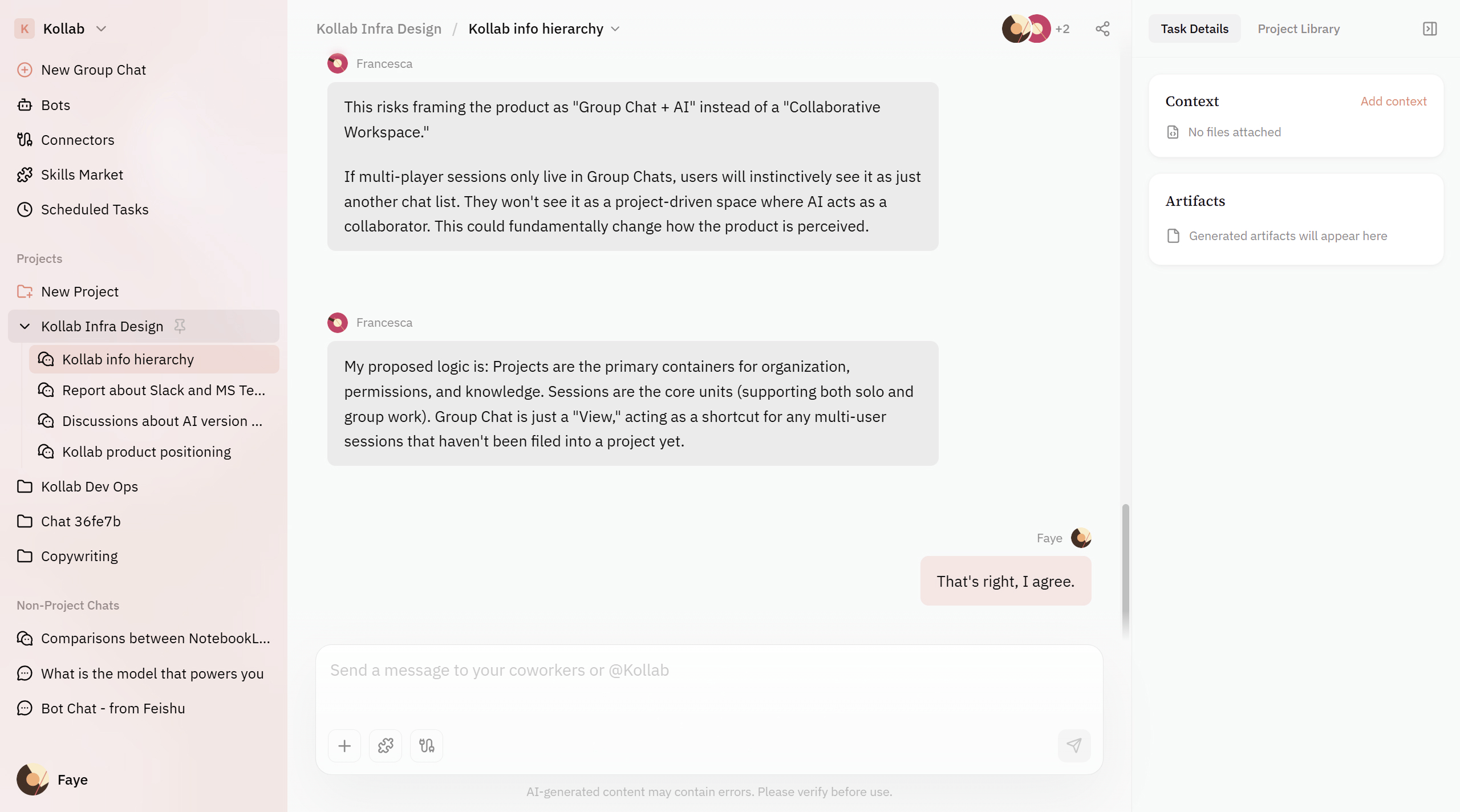 This isn’t just another chat app. It’s an AI-native workspace, where the project becomes the central unit. Around it, discussions, documents, code, design assets, and agent activity all live in the same context.