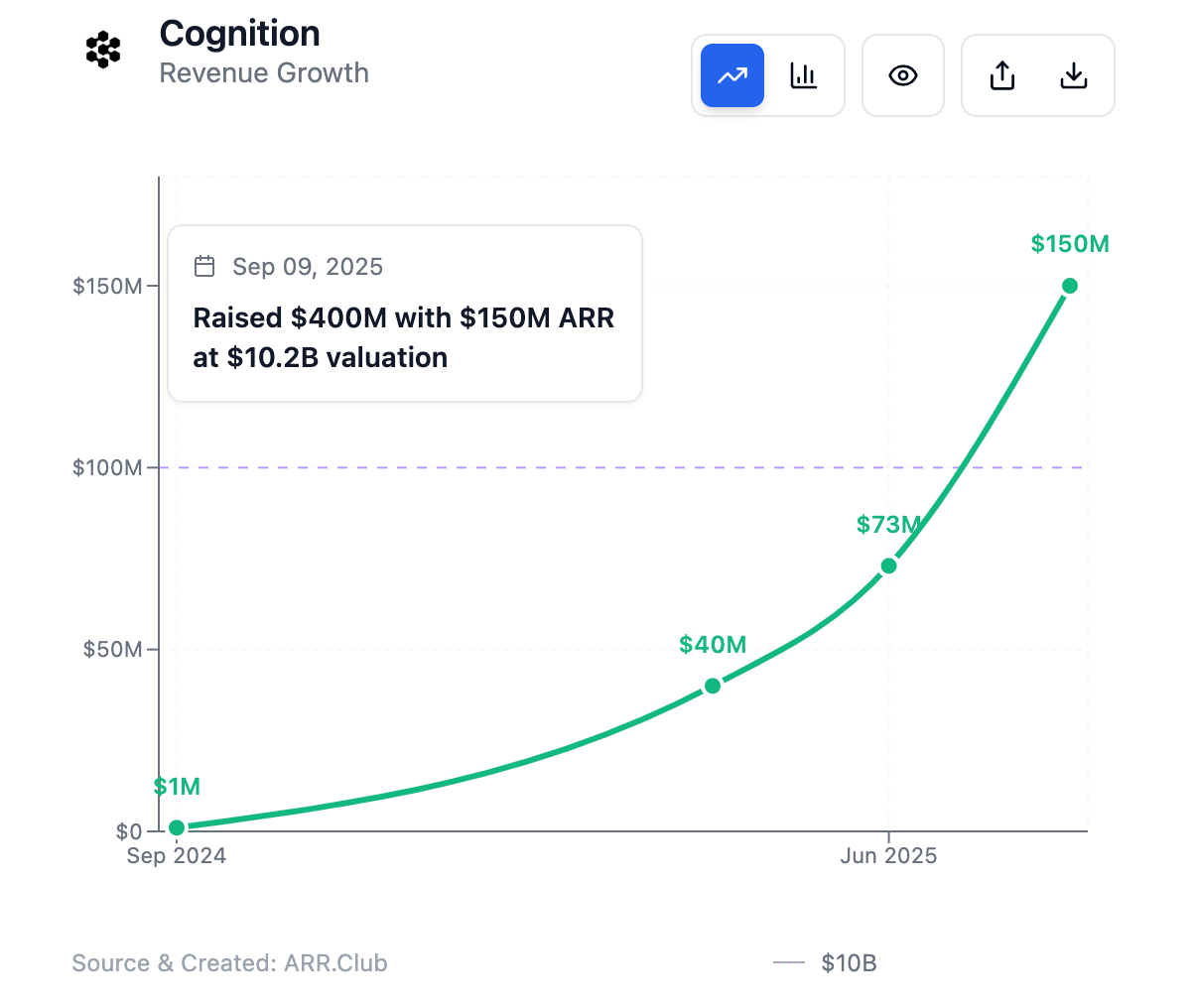 Financially, Cognition has raised over $400 million in funding at a $10.2 billion post-money valuation, led by Founders Fund with participation from Lux, 8VC, Neo, Elad Gil, and others.