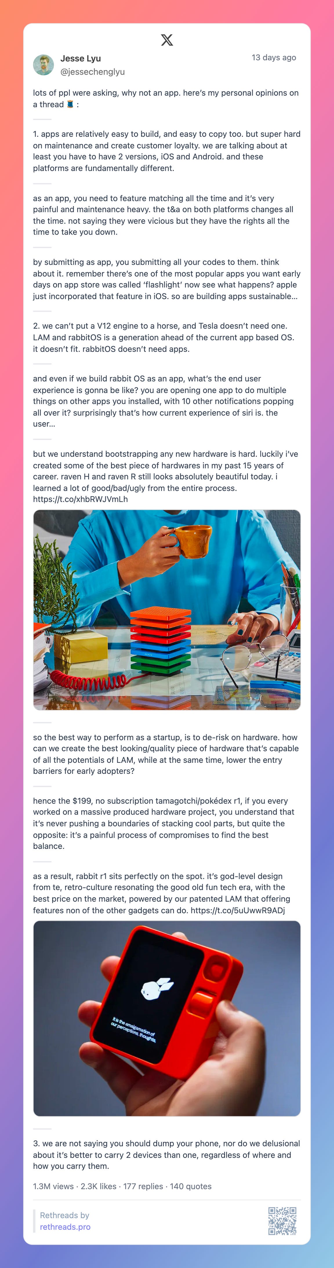 Fast Company today published a story about Rabbit’s R1, the key is Jesse’s answer to why not make a phone or an app:
